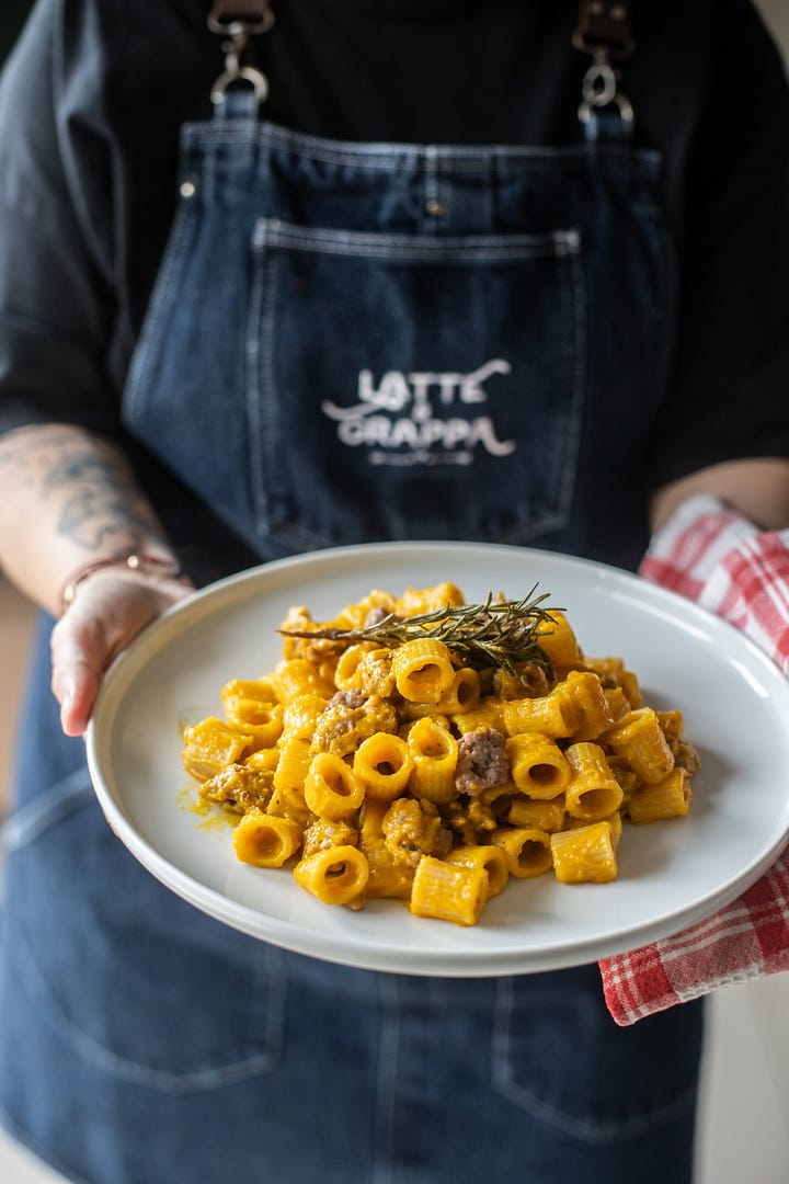 mezze maniche con zucca e salsiccia, che scalda la pancia;