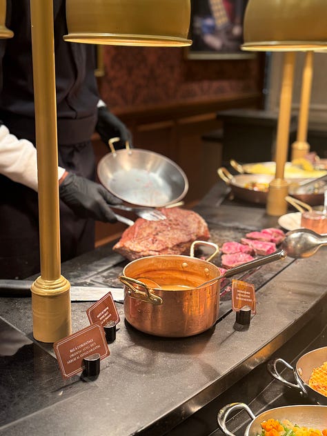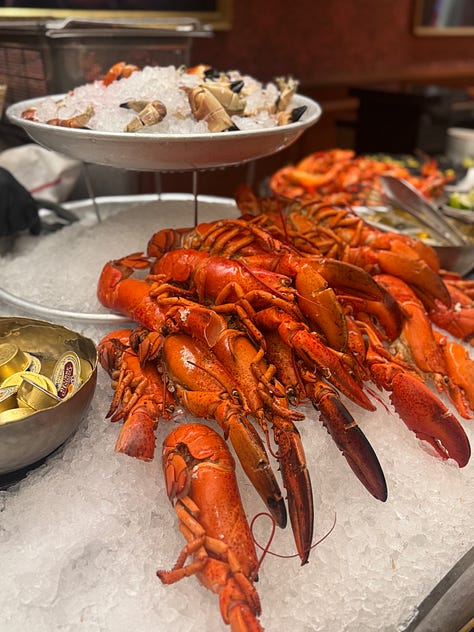Il buffet era sontuoso, scintillante, oltremodo ricco e con proposte lussuose… ma le opzioni per chi ha allergie erano ridicolmente poche. Lo spettacolo della gente poi al cospetto della cascata di aragostine e della coppa delle ostriche è stato… educativo.